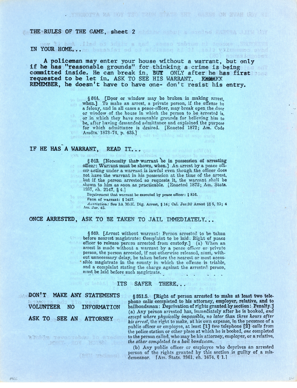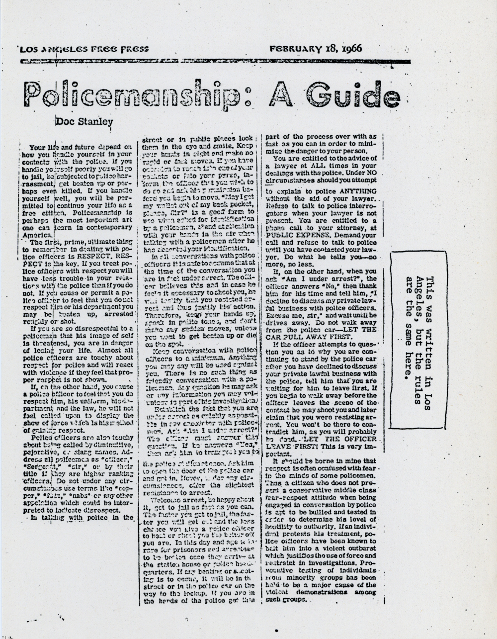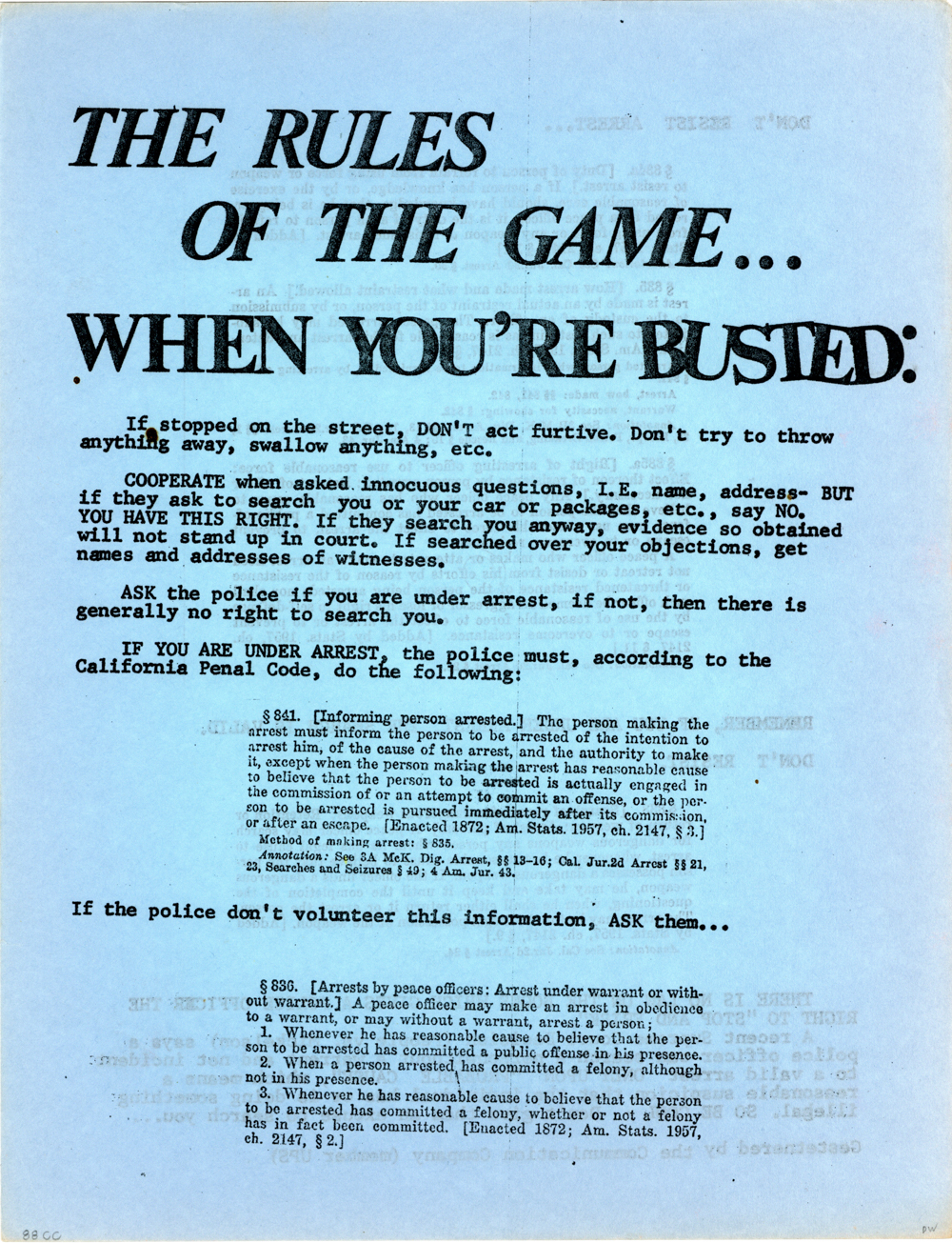 Cat. No.: CC-085a Full record BibCit: By Doc Stanley. 3/24/1967. Broadsheet. Letter size. San Francisco: Communication Company. Collection: SS-x(m) | SOLA-x(ss). Abstract: Reprint of article from Los Angeles Free Press, 2/18/66. Tells how to deal with cops. R.s: cont.