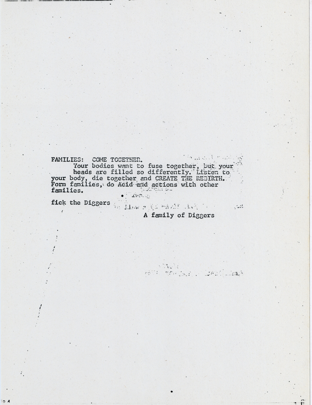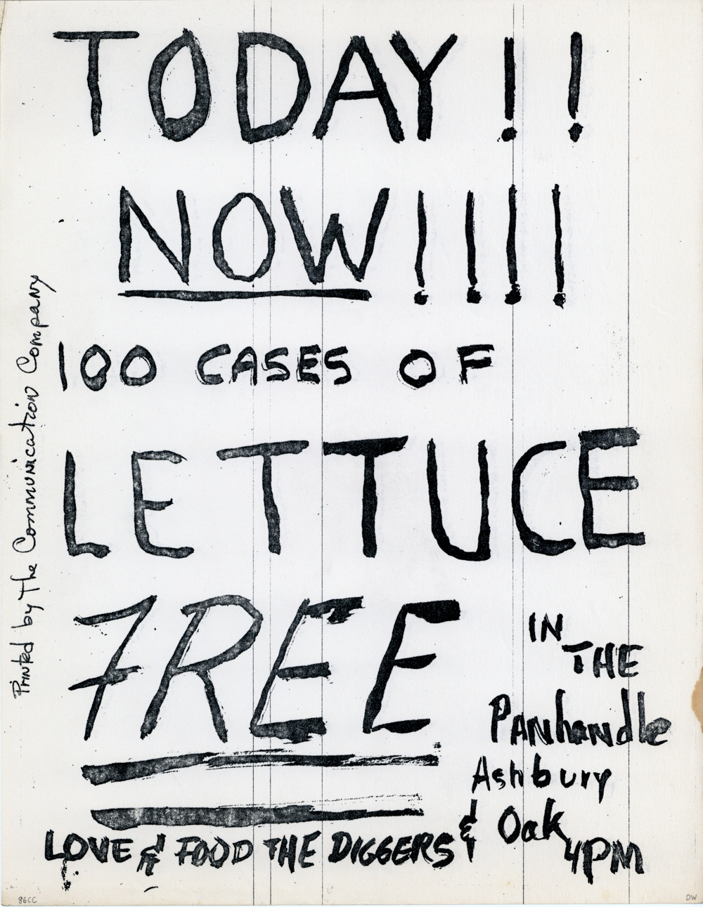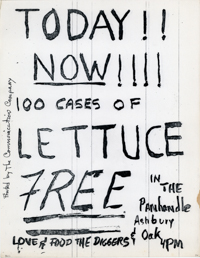 Cat. No.: CC-086 Full record BibCit: n.d.. Broadside. Letter size. San Francisco: Communication Company. Collection: SS-x(m) | SOLA-o(dw). Abstract: Free food in the Panhandle 4pm. Signed "Love & Food The Diggers".