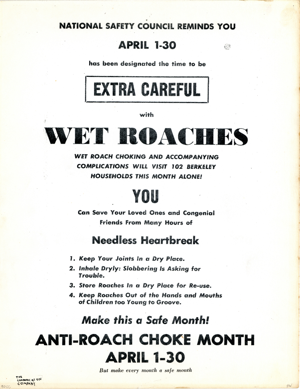 Cat. No.: CC-090 Full record BibCit: Broadside. Letter size. San Francisco: Communication Company. Collection: SS-x(m) | SOLA-o(dw). Abstract: "National Safety Council Reminds You/April 1-30/has been designated the time to be /Extra Careful/with Wet Roaches/ ...". "Anti-Roach Choke Month".