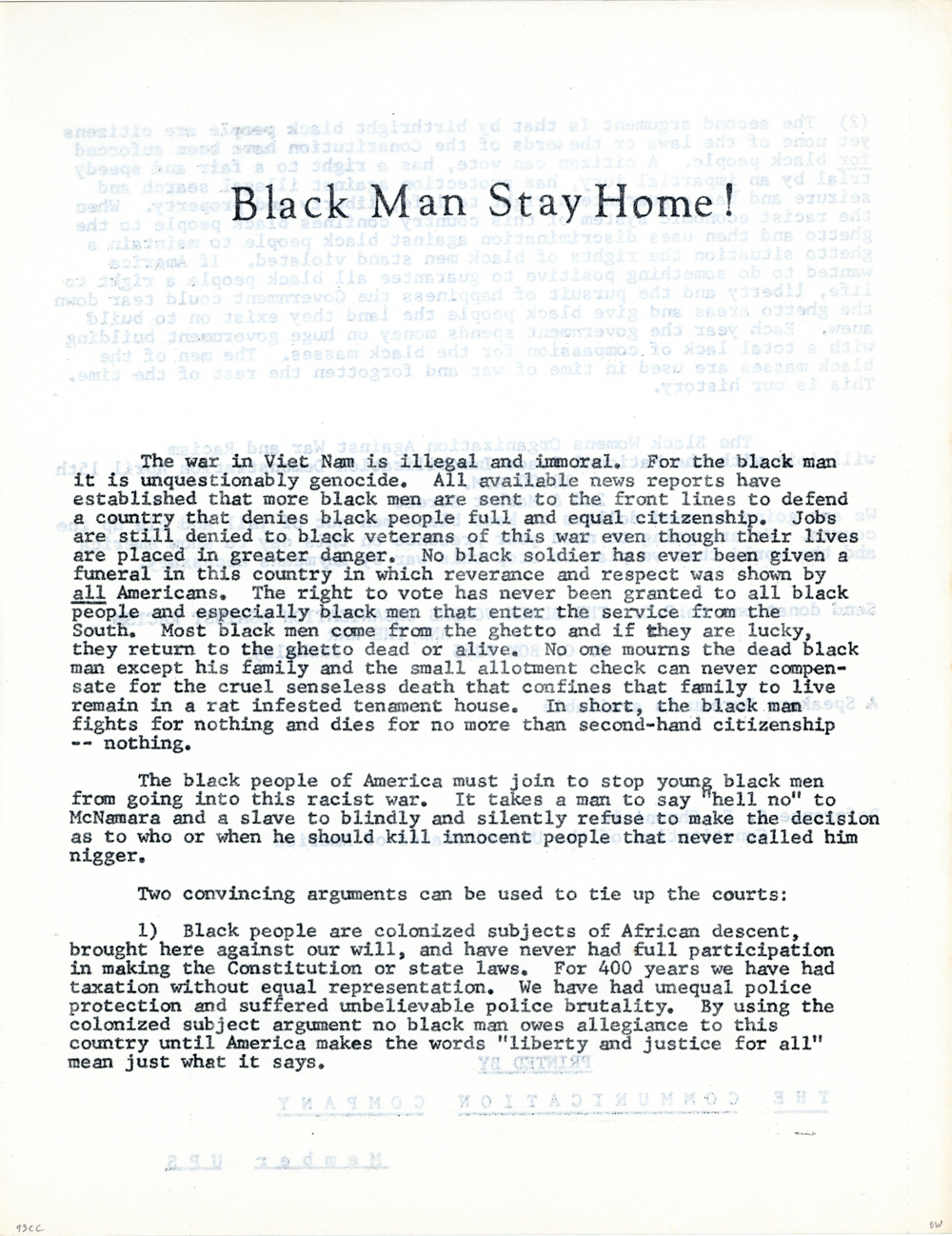 Cat. No.: CC-093a Full record BibCit: n.d.. Broadsheet. Letter size. San Francisco: Communication Company. Collection: SS-x(m) | SOLA-x(ss):SOLA-o(dw). Abstract: Telling why black men shouldn't participate in the Vietnam war. R.s.:cont.