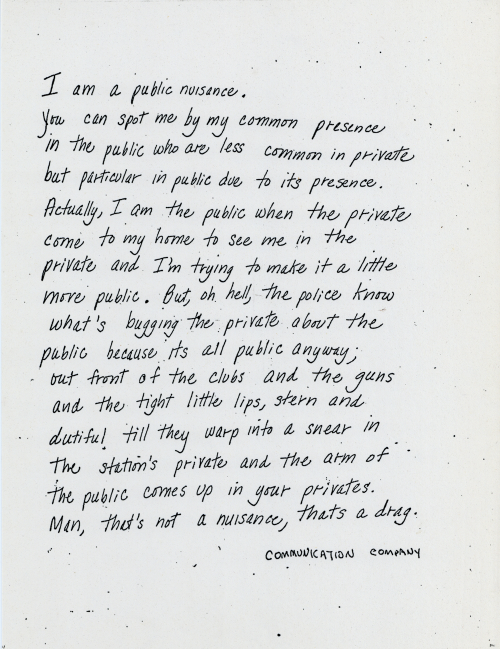 Cat. No.: CC-094 Full record BibCit: n.d.. Broadside. Letter size. San Francisco: Communication Company. Collection: SS-x(m) | SOLA-x(ss). Abstract: A statement.