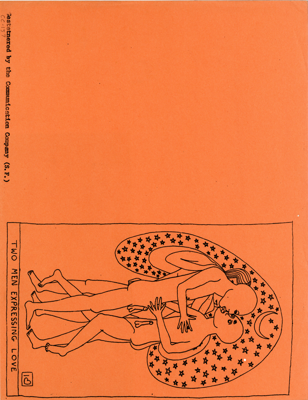 Cat. No.: CC-157 Full record BibCit: Broadside. Letter size. San Francisco: Communication Company. Imprint: ComCo (S.F.). Collation: Printed in landscape mode. Illus. with drawing.. Collection: SS-x(B) | SOLA-o(DW);o-EN($, pink sheet var.). Abstract: A drawing of two erect men embracing. The drawing fills the right half of the longwise sheet and the imprint is at the bottom of the left side of the sheet.