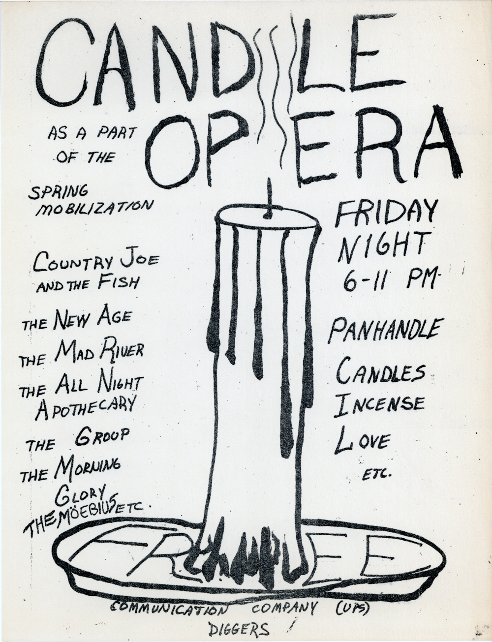 Cat. No.: CC-158 Full record BibCit: N.d., ca. 4/15/1967. Broadside. Letter size. San Francisco: Communication Company. Collation: Illus. with drawing of a candle.. Collection: SS-x(B) | SOLA-x(SS);SOLA-o($). Abstract: Announces an event in the Panhandle as part of the Spring Mobilization. Signed Diggers.