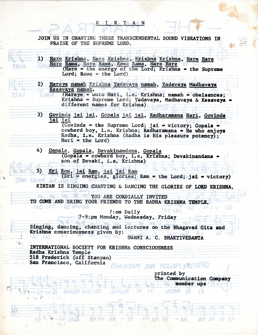 Cat. No.: CC-160a Full record BibCit: Broadsheet. Letter size. San Francisco: Communication Company. Collation: Illus. with musical notation.. Collection: SS-x(B) | SOLA-x(SS). Abstract: Music for some Krishna mantras. Printed for the ISKCON, 518 Frederick. R.s.: "Kirtan."