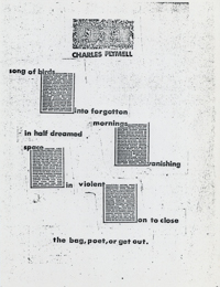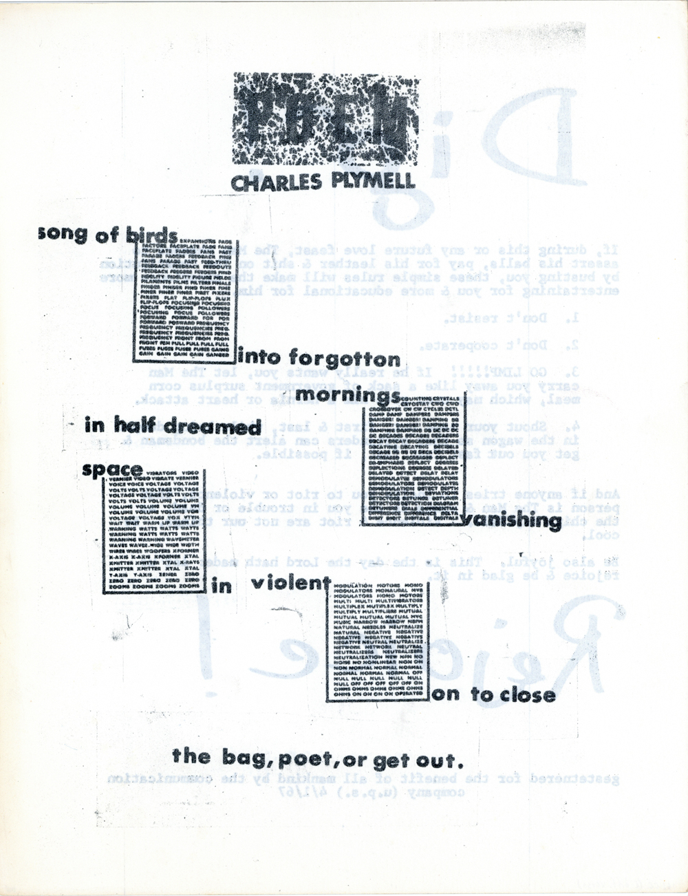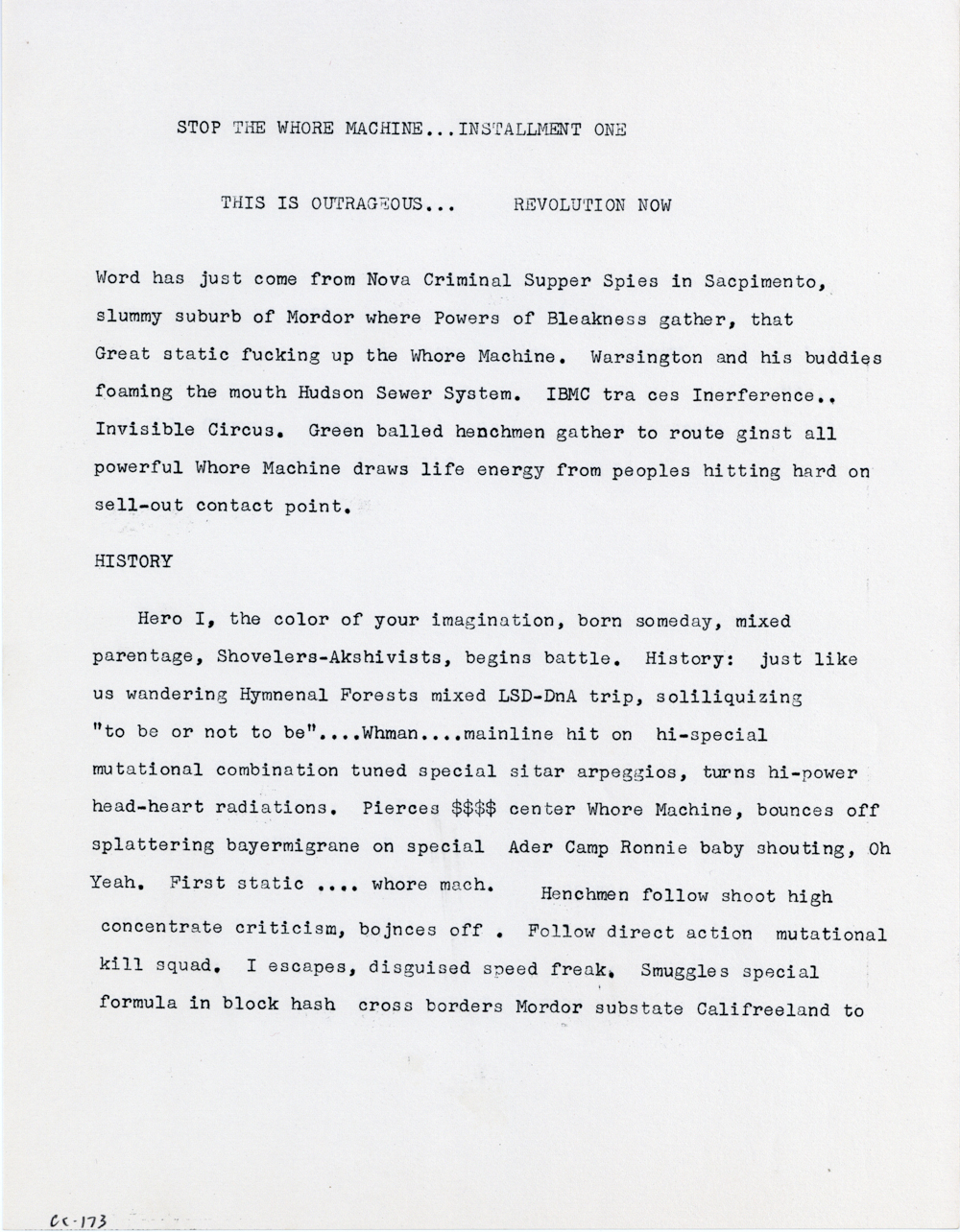Cat. No.: CC-172 Full record BibCit: Broadside. Letter size. San Francisco: ?. Collection: SS-x(M) | SOLA-x(SS). Abstract: Montage poetry. Note: no Com/Co imprint.