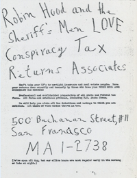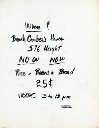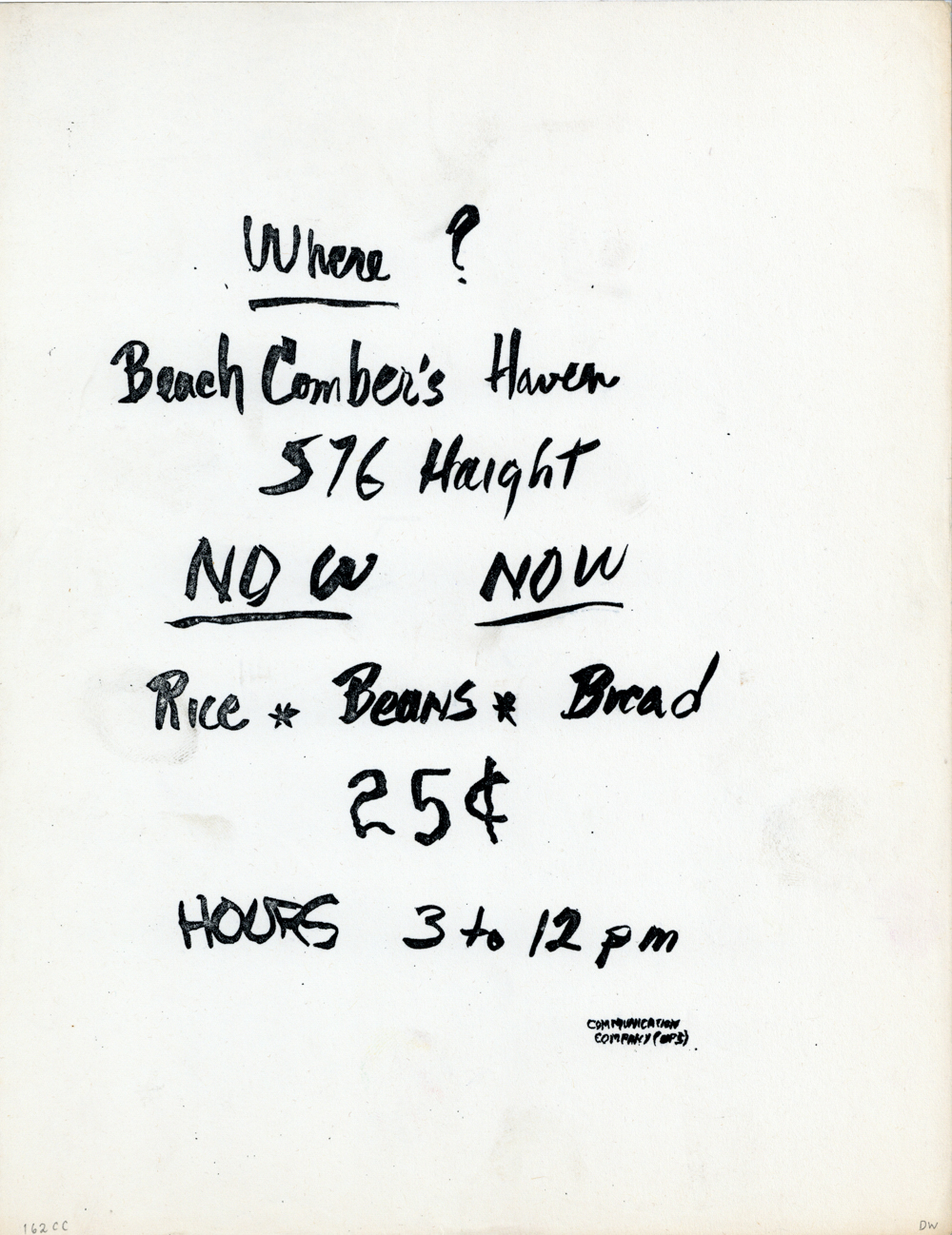 Cat. No.: CC-162 Full record BibCit: Broadside. Letter size. San Francisco: Communication Company. Collection: SS-x(B) | SOLA-o(DW). Abstract: Advertisement for a Haight Street restaurant.
