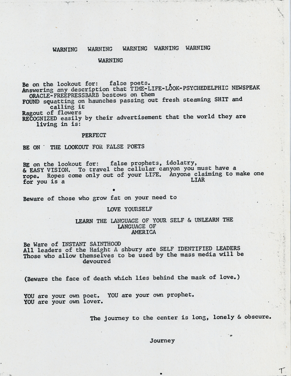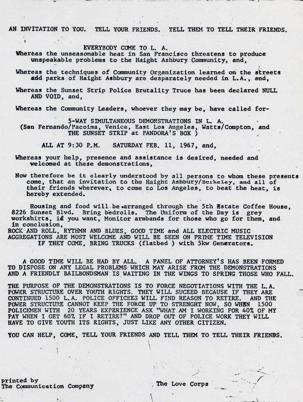 Cat. No.: CC-163 Full record BibCit: N.d., ca. 2/11/1967. Broadside. Letter size. San Francisco: Communication Company. Collection: SS-o(R) | SOLA-x(SS). Abstract: Invitation to come to Los Angeles for a five-way simultaneous demonstration on 11 Feb 1967. Signed, "The Love Corps."