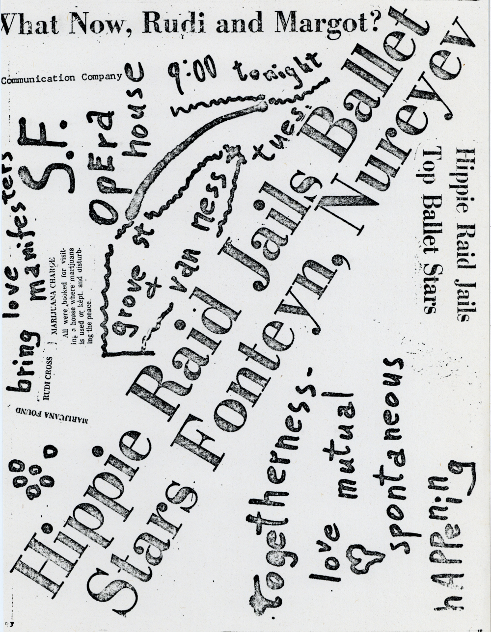 Cat. No.: CC-164 Full record BibCit: N.d., ca. [can determine]. Broadside. Letter size. San Francisco: Communication Company. Collection: SS-o(BK) | SOLA-x(SS). Abstract: A montage of newspaper headlines about the arrest of Margot Fonteyn and Rudolf Nureyev at a hippie party. Also announces a happening at the Opera House for that night (Tuesday).