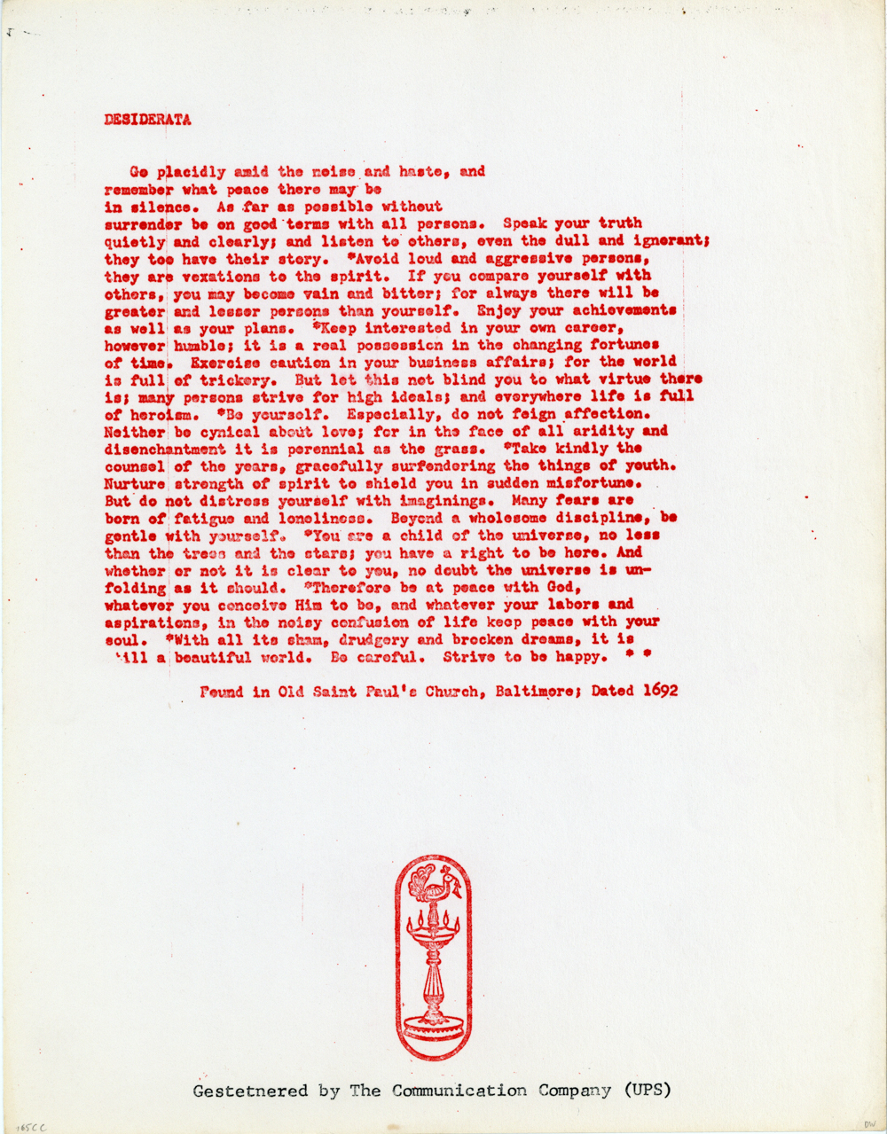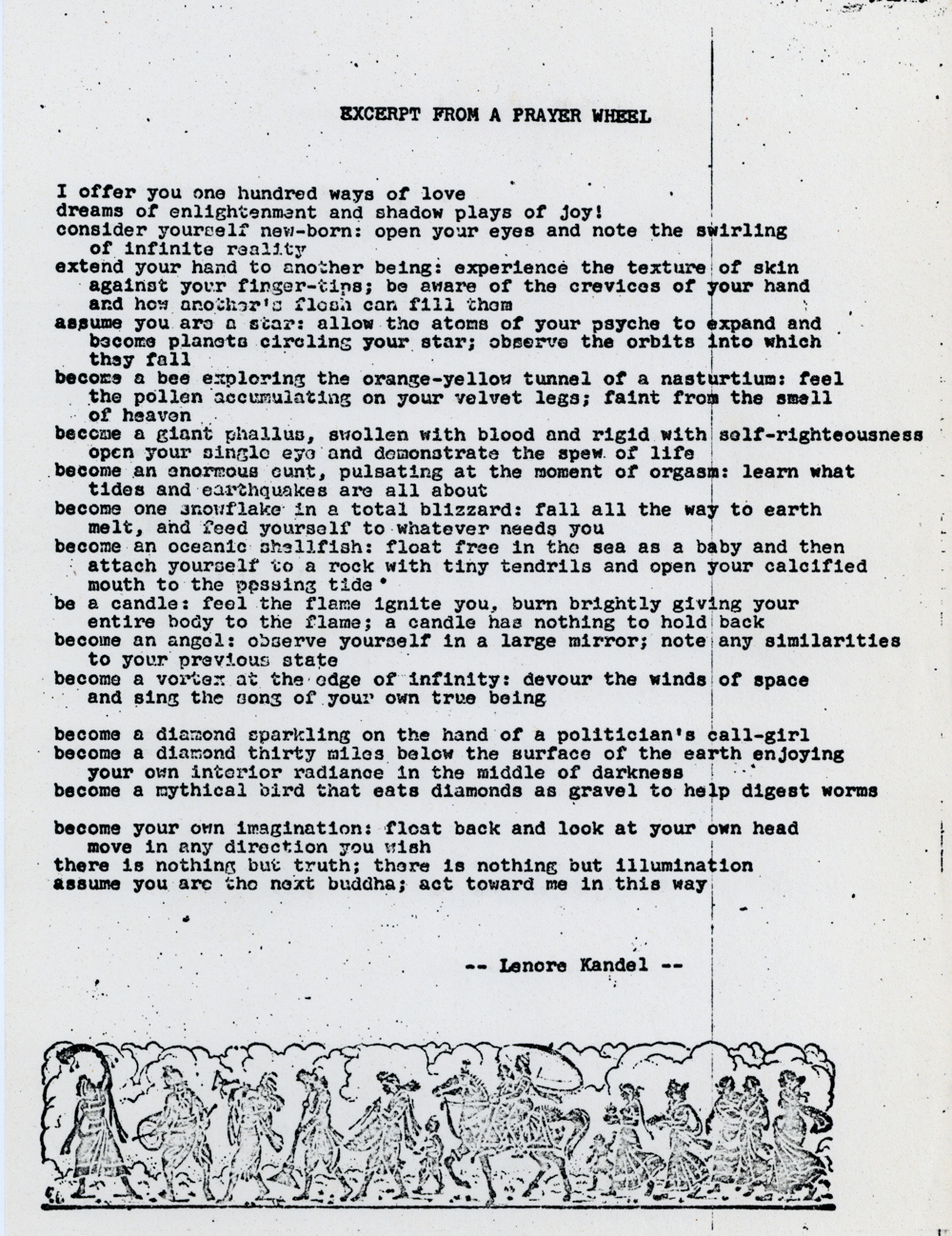 Cat. No.: CC-175 Full record BibCit: By Kandel, Lenore. Broadside. Letter size. San Francisco: ?. Collation: Illus.. Collection: SS-o(BK) | SOLA-x(SS). Abstract: Poem. Note: no Com/Co imprint.
