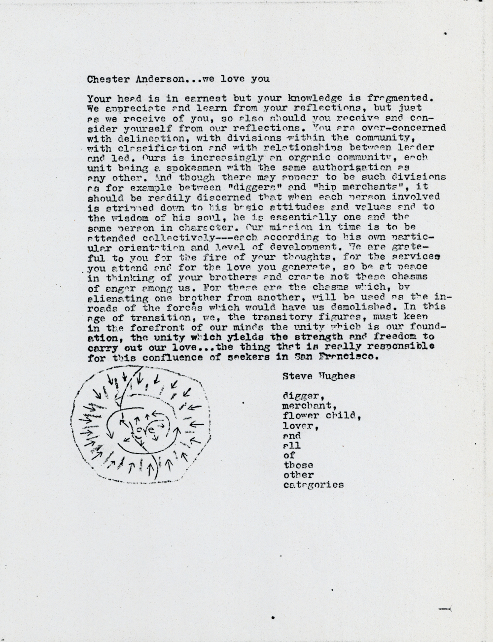 Cat. No.: CC-166 Full record BibCit: By Hughes, Steve. Broadside. Letter size. San Francisco: ?. Collation: 1/c (Re on Ye Pa). Collection: SS-o(L) | SOLA-x(SS). Abstract: Criticizes Chester Anderson for focussing on divisions in the community. Signed "Steve Huges, digger, merchant, flower child, lover, ..." Note: No Com/Co imprint.