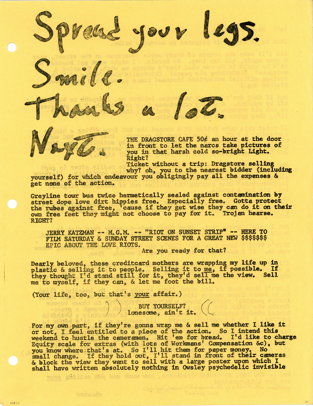 Cat. No.: CC-168a Full record BibCit: By Anderson, Chester. 4/8/1967. Broadsheet. Letter size. San Francisco: Communication Company. Collection: SS-o(L) | SOLA-o(DW);SOLA-x(Blaine). Abstract: Put down of Jerry Katzman and MGM in the Haight to film "Love Riots."