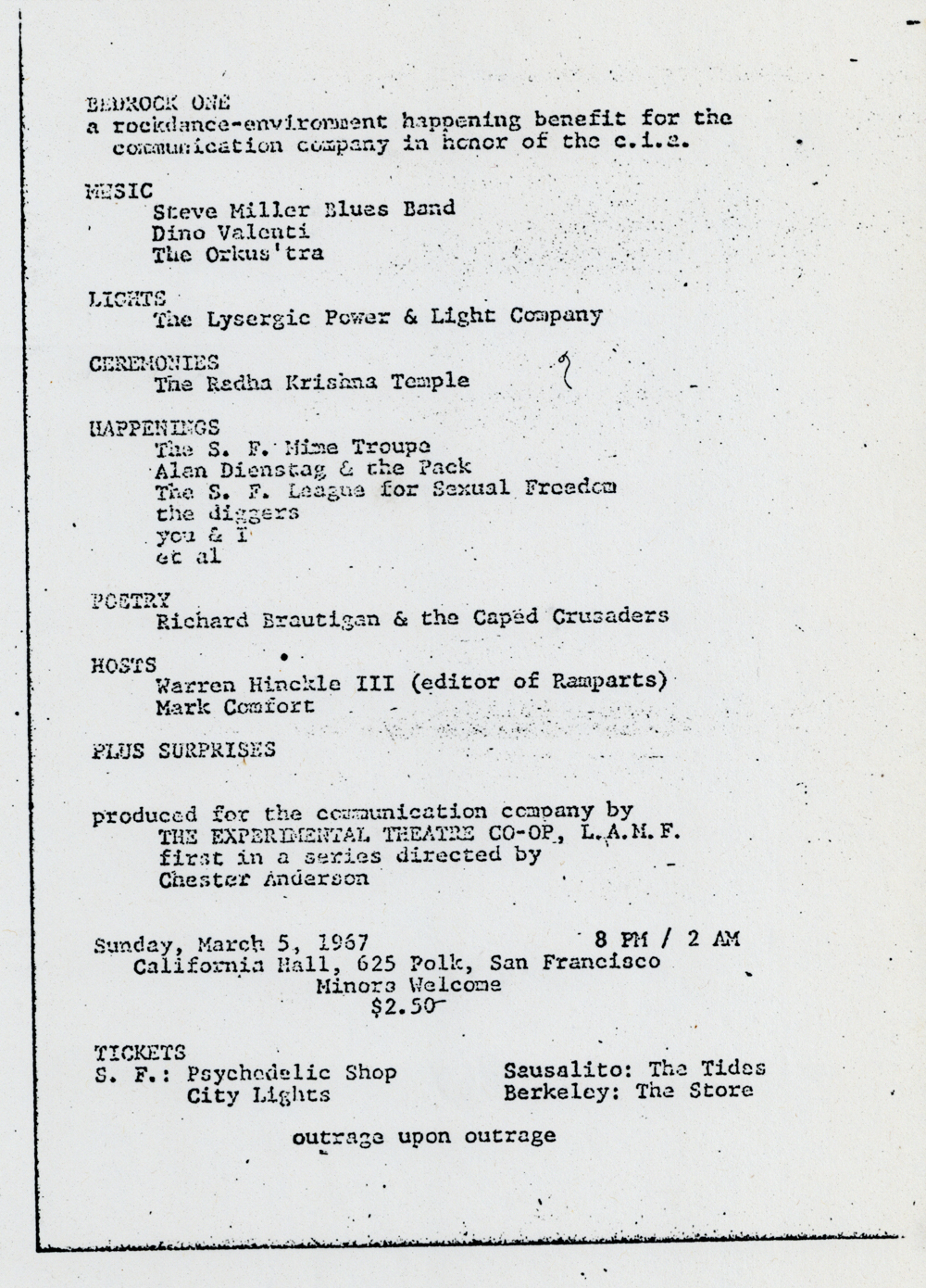 Cat. No.: CC-169 Full record BibCit: N.d., ca. 3/5/1967. Broadside. 7"x9-7/8". San Francisco: ?. Collection: SS-x(BL) | SOLA-x(SS). Abstract: Announces an event produced for the Communication Company to be held 5 Mar 1967 at California Hall. Tickets, $2.50. This is different from CC-132. Note: no Com/Co imprint.