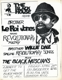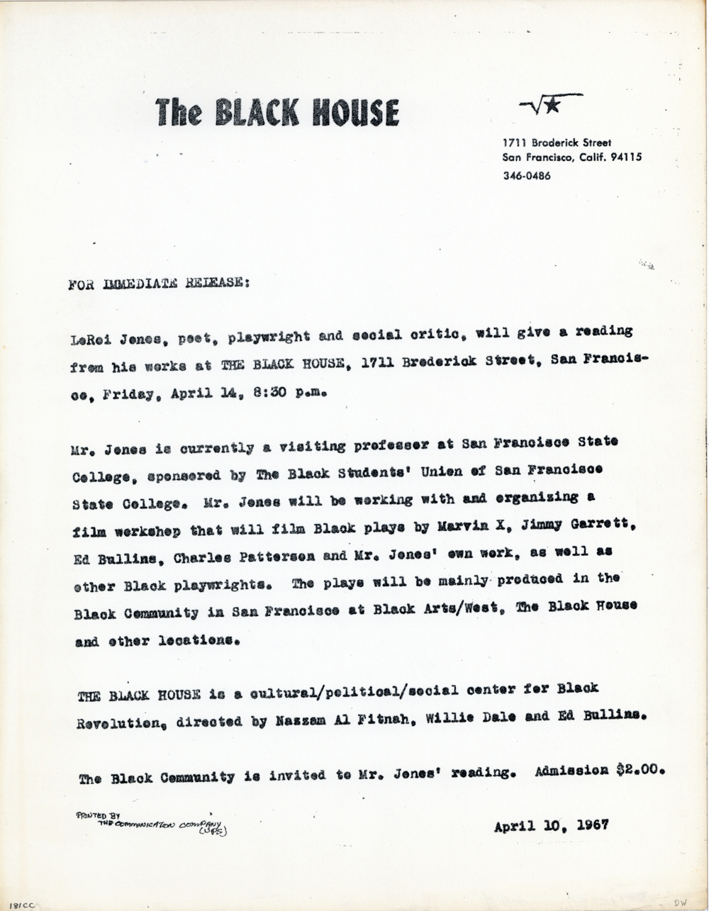 Cat. No.: CC-181 Full record BibCit: 4/10/1967. Broadside. Letter size. San Francisco: Communication Company. Collection: SOLA-o(DW). Abstract: Announces a reading by LeRoi Jones for 14 Apr 1967, 1711 Broderick. Admission: $2.