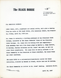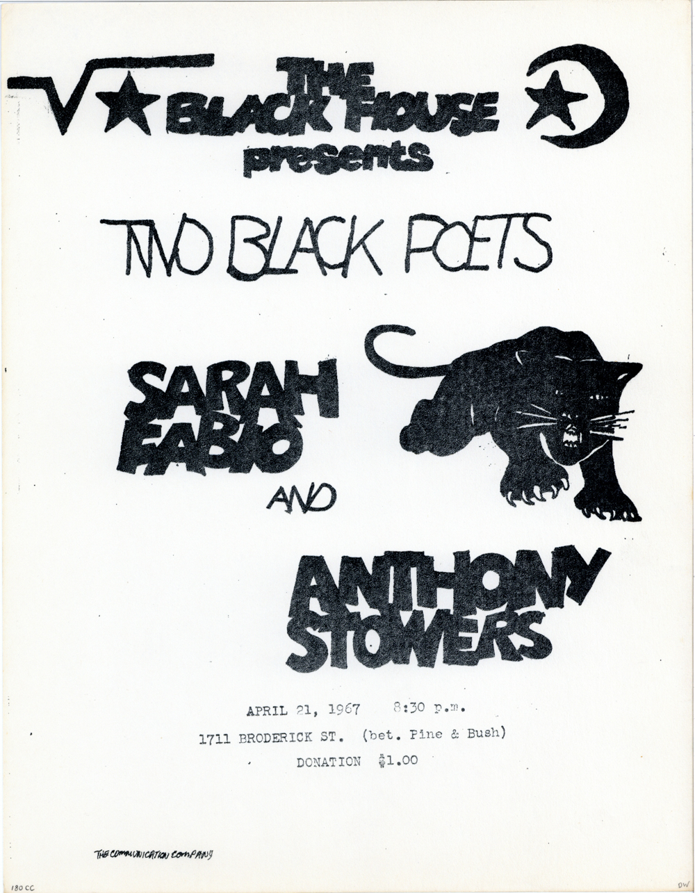 Cat. No.: CC-179 Full record BibCit: N.d., ca. 4/28/1967. Broadside. Letter size. San Francisco: Communication Company. Collation: Illus.. Collection: SOLA-o(DW). Abstract: A benefit to get the Black House out of jail, to be held 28 Apr 1967 at 1711 Broderick. $2 donation.