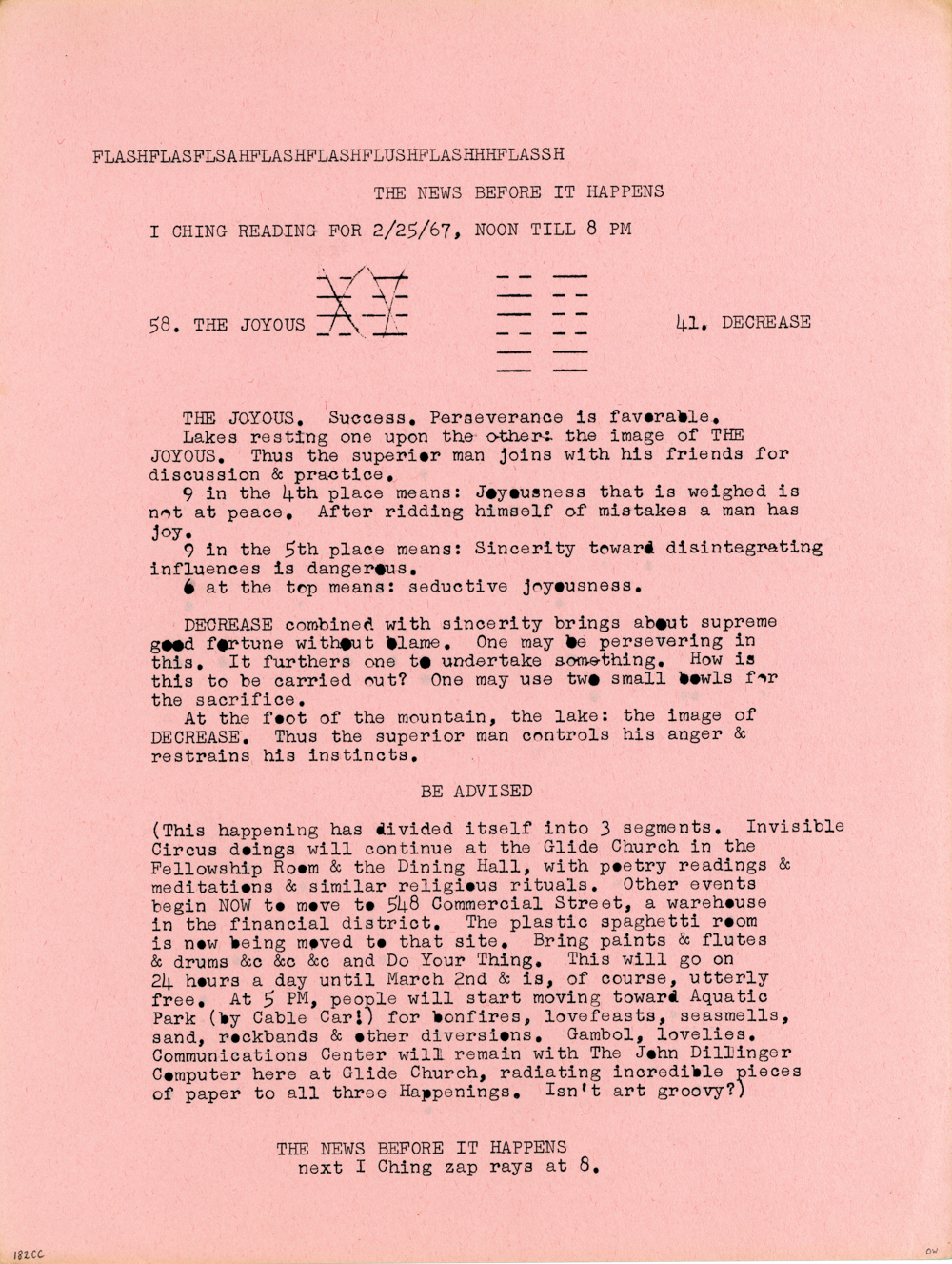 Cat. No.: CC-182 Full record BibCit: 2/25/1967. Broadside. Letter size. San Francisco: ?. Collection: SOLA-o(DW). Abstract: Invisible Circus I Ching reading and announcement of activities taking place in different parts of town. Note: no Com/Co imprint.
