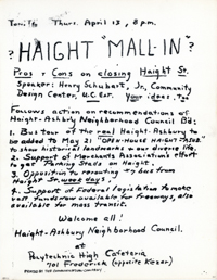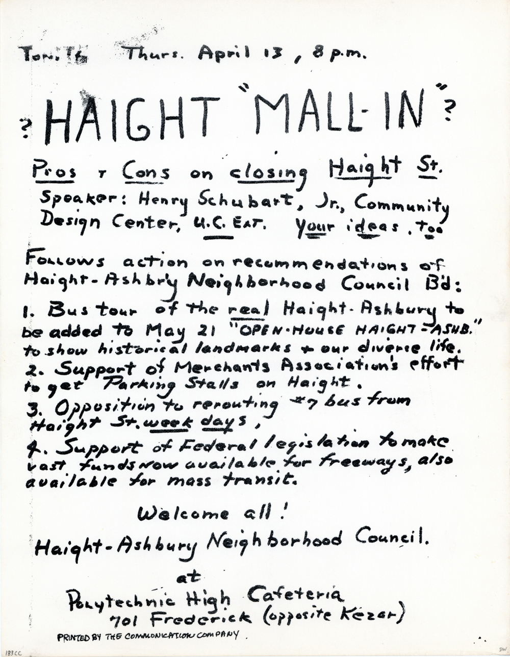 Cat. No.: CC-183 Full record BibCit: Broadside. Letter size. San Francisco: Communication Company. Collection: SOLA-o(DW). Abstract: A meeting presented by the Community Design Center on ideas to close Haight Street.