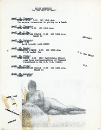 Cat. No.: CC-184 Full record BibCit: N.d., ca. 4/13/1967. Broadside. Letter size. San Francisco: Communication Company. Collation: Illus. with drawing of nude woman.. Collection: SOLA-o(DW). Abstract: Various events, e.g. Work Circle, Open House, Communication Circle, listed for 165 18th Avenue.