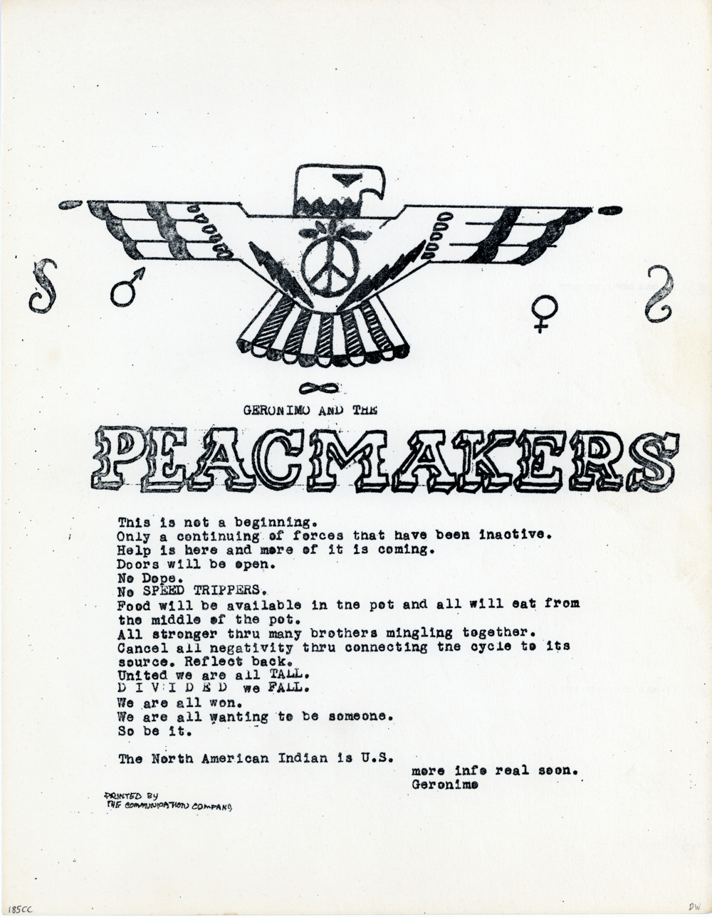 Cat. No.: CC-185 Full record BibCit: Broadside. Letter size. San Francisco: Communication Company. Collation: Illus. with drawing of stylized eagle and peace symbol at top of page.. Collection: SOLA-o(DW). Abstract: A poem.