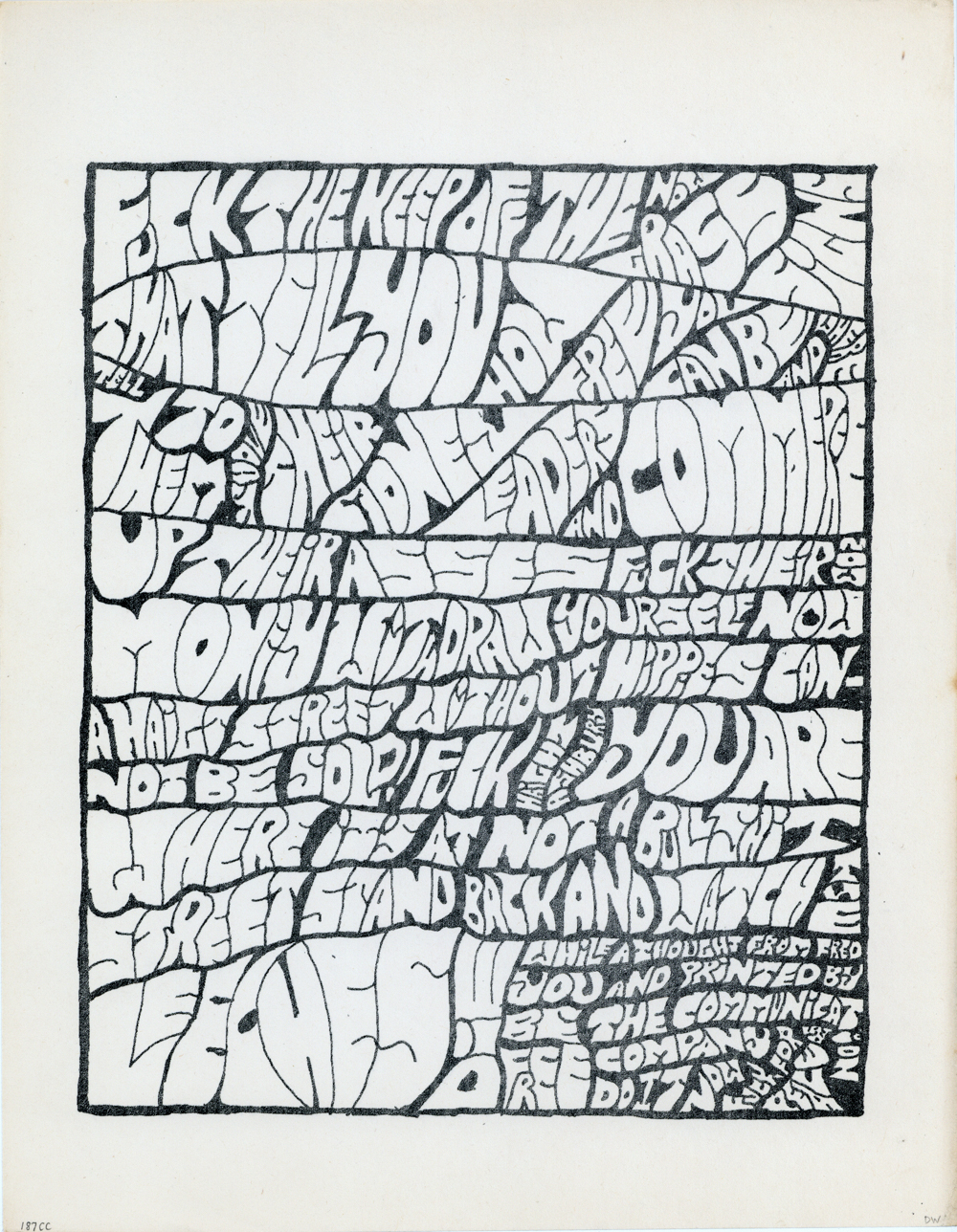 Cat. No.: CC-187 Full record BibCit: Broadside. Letter size. San Francisco: Communication Company. Collection: SOLA-o(DW). Abstract: A manifesto in psychedelic lettering.