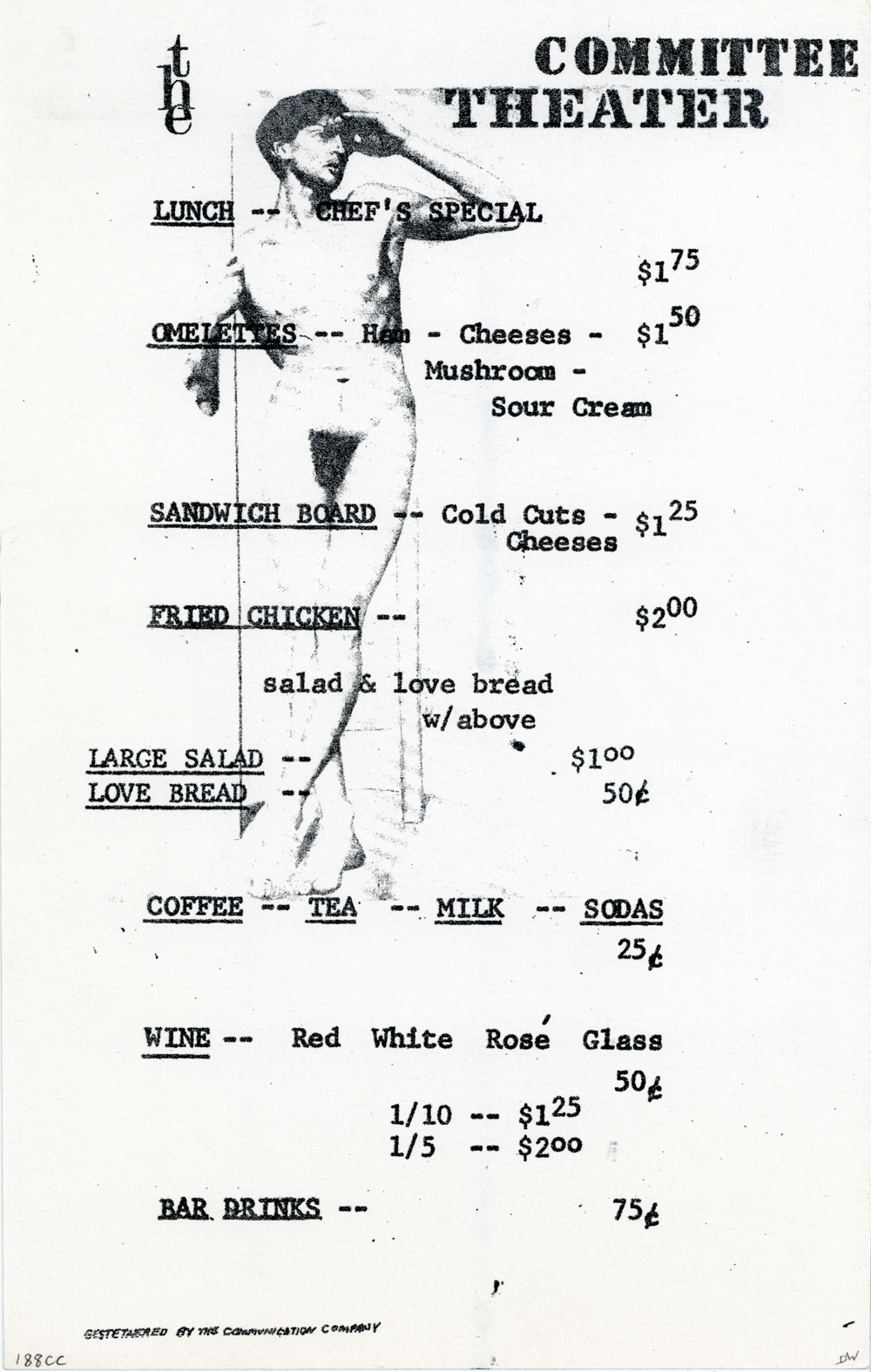 Cat. No.: CC-188 Full record BibCit: Broadside. 5-1/2"x8-1/2". San Francisco: Communication Company. Collation: Illus. with photo-repro of a nude figure.. Collection: SOLA-o(DW). Abstract: A menu printed over a nude figure.