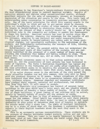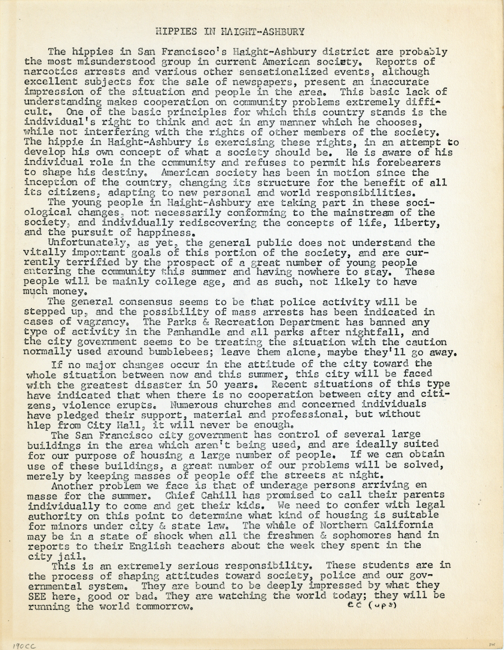 Cat. No.: CC-190 Full record BibCit: By Anon. [Chester Anderson?]. Broadside. Letter size. San Francisco: Communication Company. Collection: SOLA-o(DW). Abstract: Editorial explaining the role of the hippies and discussing the city government's response.