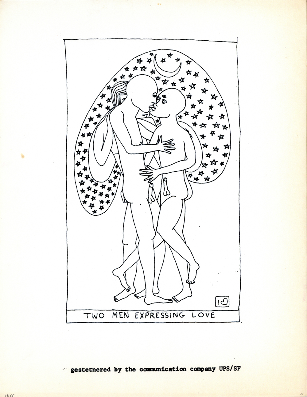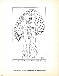 Cat. No.: CC-191 Full record BibCit: Broadside. Letter size. San Francisco: Communication Company. Collation: Illus. with pen drawing.. Collection: SOLA-o(DW). Abstract: Title of drawing showing two men embracing. This item different from CC-157.