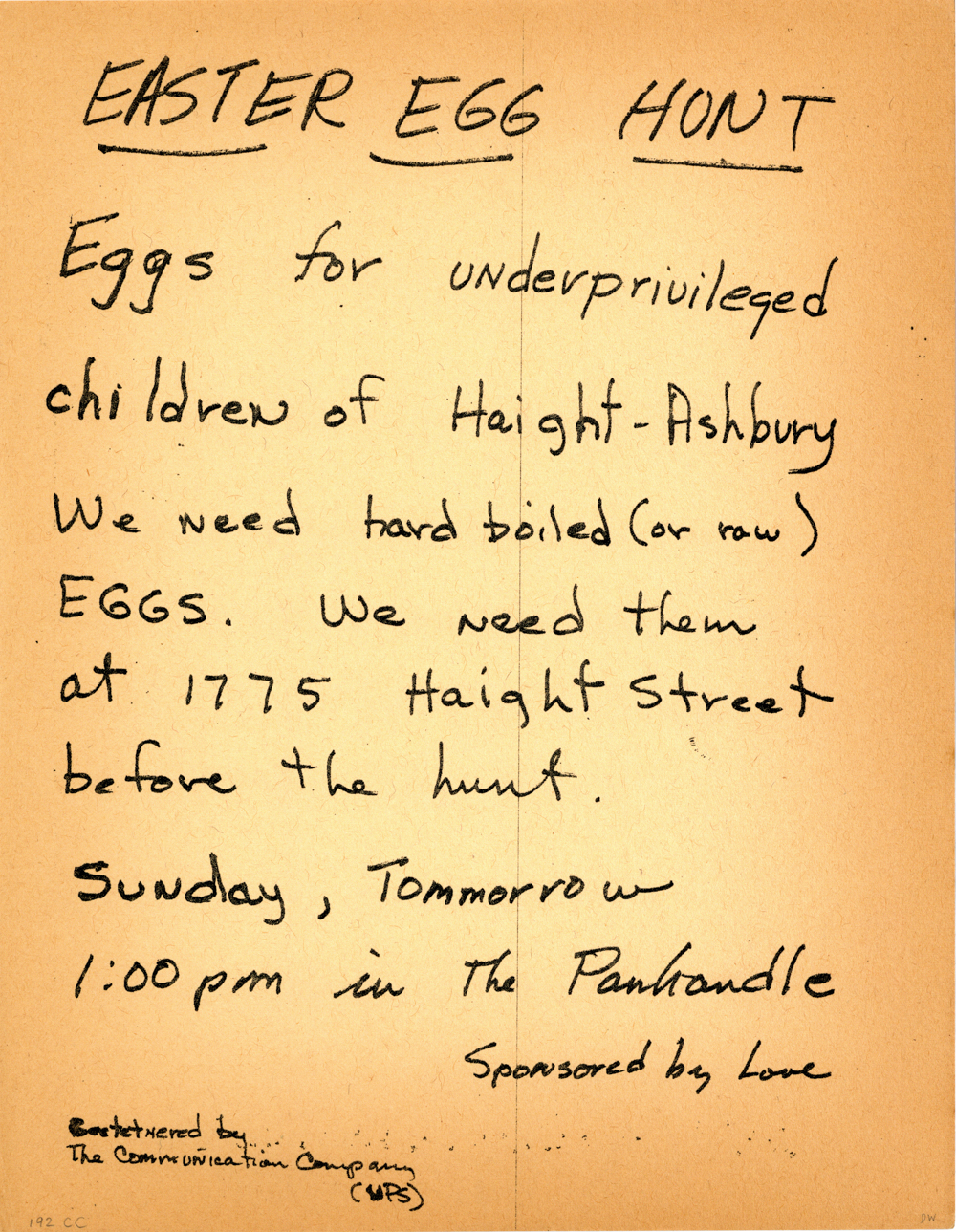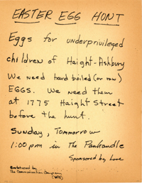 Cat. No.: CC-192 Full record BibCit: N.d., ca. Easter, 1967.. Broadside. Letter size. San Francisco: Communication Company. Collation: Ye Pa. Collection: SOLA-o(DW). Abstract: Asks people to bring eggs to 1775 Haight Street before the Easter egg hunt (Sunday 1:00 in the Panhandle). Signed, "Sponsored by Love."