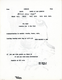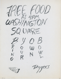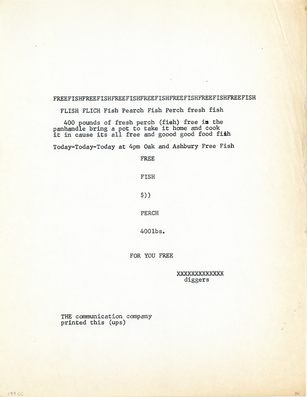 Cat. No.: CC-193 Full record BibCit: Broadside. Letter size. San Francisco: Communication Company. Collection: SOLA-o(DW). Abstract: Announces free fish for "today at 4pm Oak and Ashbury." Signed, "diggers."