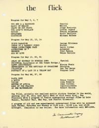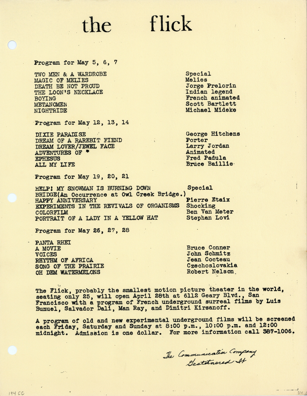 Cat. No.: CC-194 Full record BibCit: N.d., ca. 4/28/1967. Broadside. Letter size. San Francisco: Communication Company. Collation: Ye Pa. Three-hole punch on left margin.. Collection: SOLA-o(DW). Abstract: Program announcements for a 25-seat theater at 6112 Geary Boulevard, opening 28 Apr 1967.