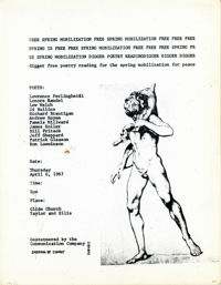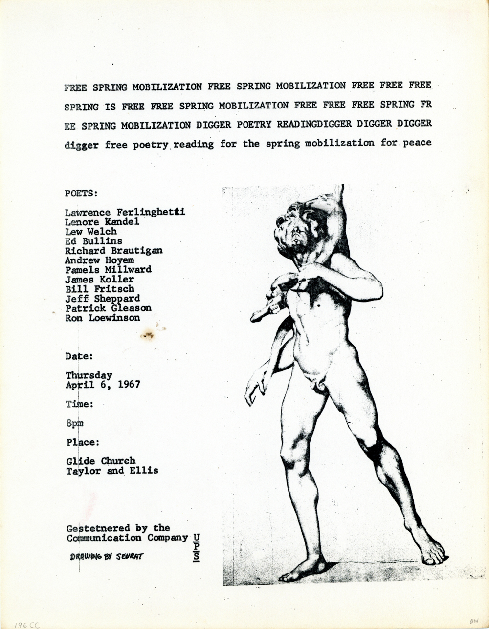 Cat. No.: CC-196 Full record BibCit: N.d., ca. 4/6/1967. Broadside. Letter size. San Francisco: Communication Company. Collation: Illus. with drawing of nude figure.. Collection: SOLA-o(DW, 2nd c. $, var. on GrPa). Abstract: Announces "digger free poetry reading for the spring mobilization for peace" Thursday, 6 Apr 1967, 8pm at Glide Church, to include: Lawrence Ferlinghetti, Lenore Kandel, Lew Welch, Ed Bullins, Richard Brautigan, Andrew Hoyem, Pamels Millward, James Koller, Bill Fritsch, Jeff Sheppard, Patrick Gleason, and Ron Loewinson.