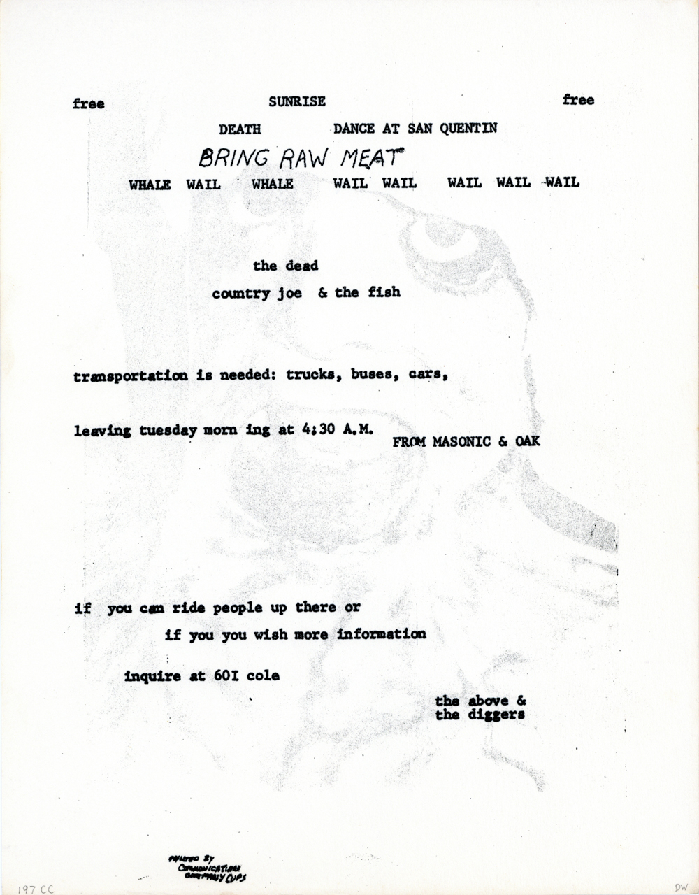 Cat. No.: CC-197 Full record BibCit: Broadside. Letter size. San Francisco: Communication Company. Collection: SOLA-o(DW). Abstract: Execution vigil/protest "leaving tuesday morning at 4:30 A.M." Signed, "the diggers."