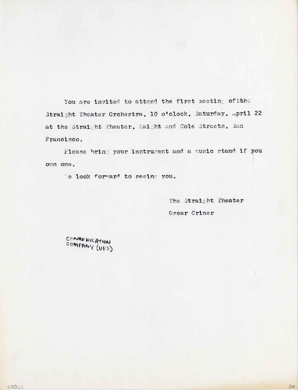 Cat. No.: CC-200 Full record BibCit: N.d., ca. 4/22/1967. Broadside. Letter size. San Francisco: Communication Company. Collection: SOLA-o(DW). Abstract: Invitation to musical meeting. Signed, "Oscar Criner."