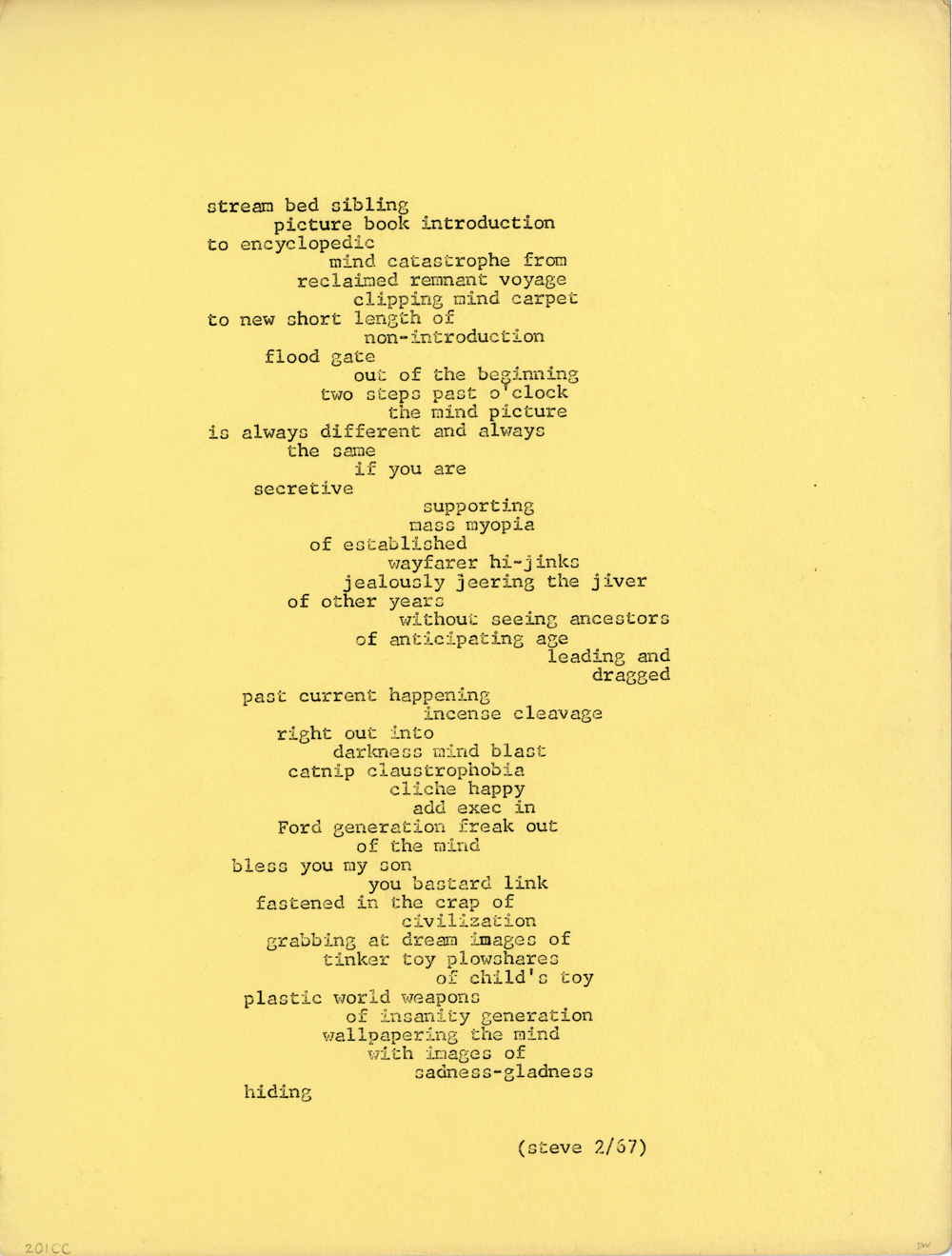 Cat. No.: CC-201 Full record BibCit: Dated: "2/67". Broadside. Letter size. N.P., ComCo?. Collation: Ye Pa. Collection: SOLA-o(DW). Abstract: Poem by "Steve."