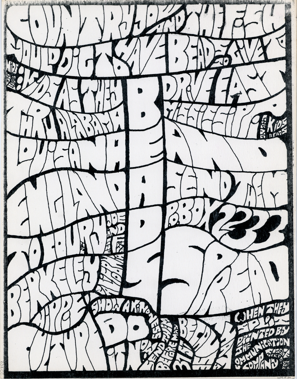 Cat. No.: CC-202 Full record BibCit: N.d., ca. 5/31/1967. Broadside. Letter size. San Francisco: Communication Company. Collation: Lettering in psychedelic style. 1/c.. Collection: SOLA-o(DW). Abstract: Soliciting donations of beads to give away on their upcoming tour. "Send before May 31." "Spread hippie culture. Show a kindness. Do it now before May 31st because that's when they split."